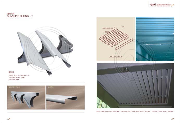 遮陽天花使其所在的空間更加清新通暢,與專用龍骨裝配。具有獨特的裝飾效果、安裝便捷、立體感強、令人耳目一新,倍感覺驚艷。