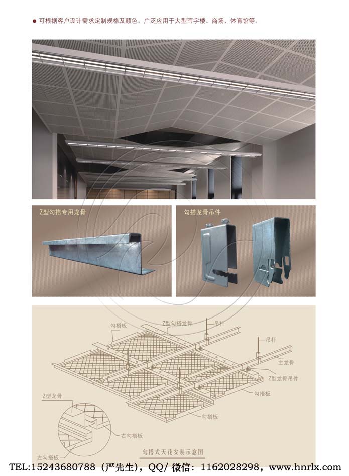 鋁單板、鋁天花、鋁板幕墻、鋁扣板、掛片天花、鋁方通、條扣天花、格柵天花、方板天花、Z型勾搭龍骨、A字龍骨、型材方通龍骨、輕鋼龍骨、烤漆龍骨、圓管天花